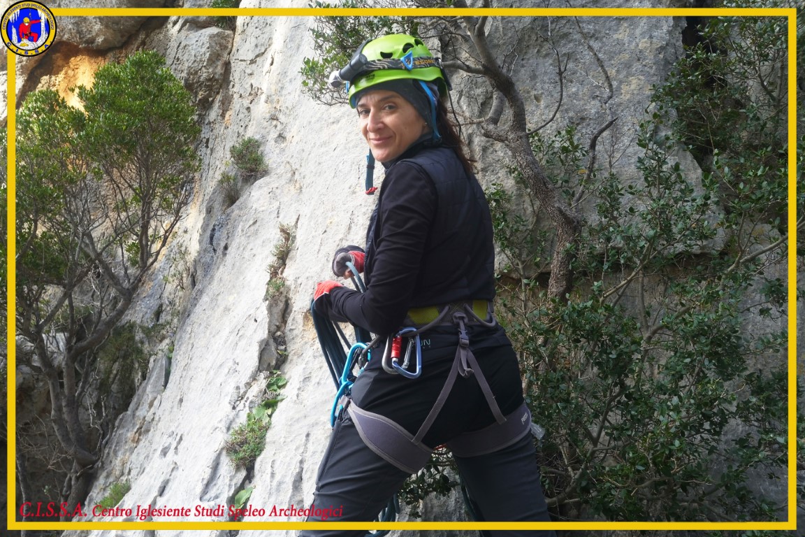 Raggiunto il primo armo, che si presenta su una parete verticale di circa 15 m di altezza con un comodo iniziale gradino di sosta, Adriano Ur. si appresta ad attrezzarlo alla velocità della luce. Chiama l’ordine di discesa e chiede a Barbara, che sarà la prima a calarsi, di fare da sicura ai compagni che scenderanno di seguito. La gola che ci accingiamo a percorrere è incastonata tra due pareti calcaree e si affaccia sul massiccio montuoso del Corrasi, offrendoci per tutta la discesa una visuale mozzafiato.